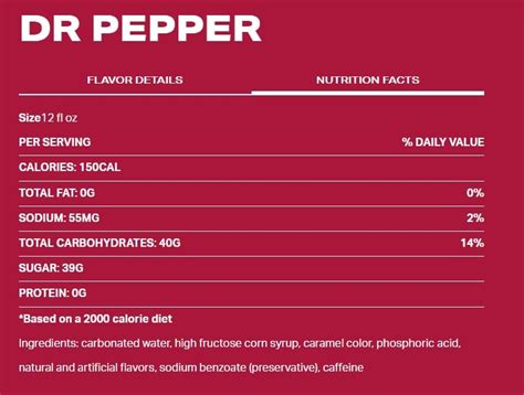 % daily value (based on a 2,000 calorie diet and adult bodyweight) update the values for someone: But dr pepper also has 23 different. Web discover nutritional facts and all the ingredients information you need for dr pepper and its variants.